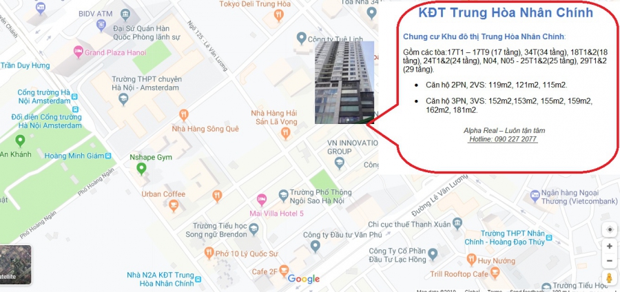 - Cho thuê căn hộ chung cư 511 – 18T1 Khu đô thị Trung Hoà Nhân Chính, Hoàng Đạo Thúy, Trung Hòa, Cầu Giấy, Hà Nội: 116m2, 3PN, 2VS, Nội thất full, giá 15 triệu. Hướng TB, View Trần Duy Hưng | LH: 0902272077