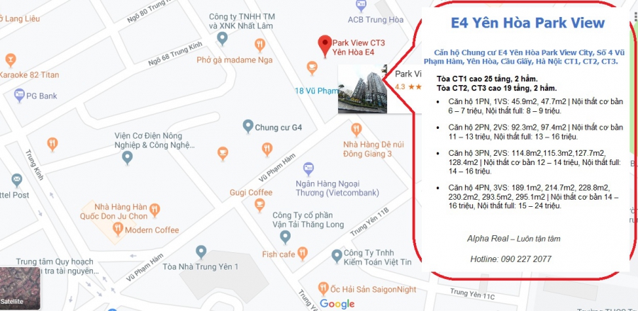 - Cho thuê Căn hộ Chung cư VIP 2201 – CT1 E4 Yên Hòa Park View, Khu đô thị mới Yên Hòa, Số 4 Vũ Phạm Hàm, Yên Hòa, Cầu Giấy, Hà Nội: 295.1m2, 4PN, 3VS, 2 Logia rộng, Nội thất full, giá 24.5 triệu. Hướng cửa vào TN, 3 mặt thoáng, View Công viên Cầu Giấy… | LH: 0902272077