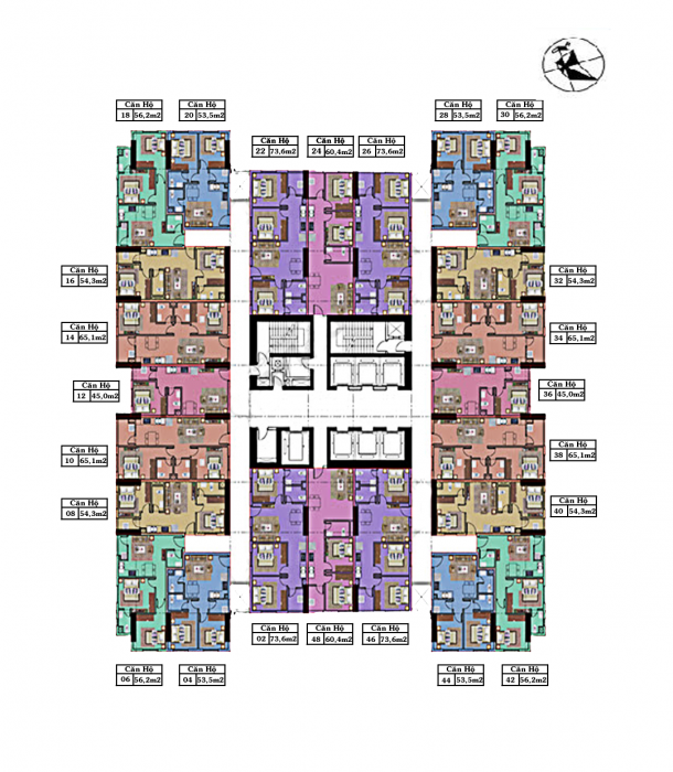 Về cơ bản mặt bằng các khối công trình gồm thành phần chính, đó là: toàn bộ nút giao thông đứng được bố trí tại lõi trung tâm khu đất, đáp ứng một cách linh hoạt việc phân chia chức năng sử dụng, độc lập về giao thông đồng thời tạo sự tiếp cận tối đa với thiên nhiên xung quanh.