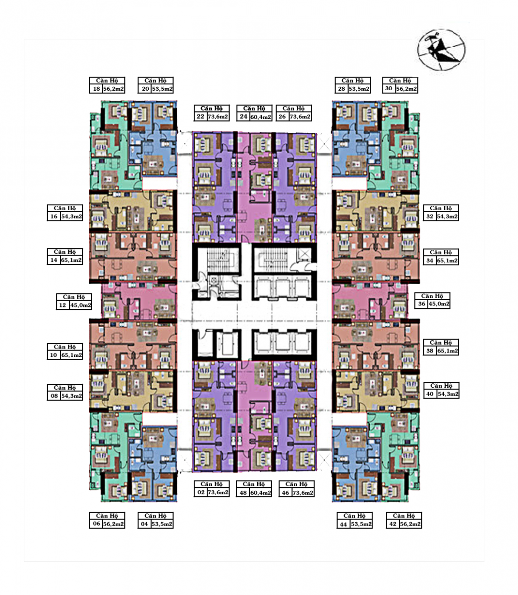 – Căn hộ thiết kế 2 phòng ngủ: 53.5m2, 54.3m2, 56.2m2, 65.1m2, 60.4m2,