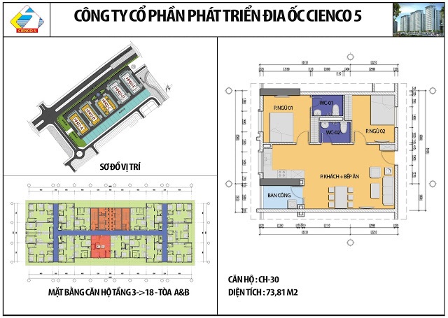 Căn 2 phòng ngủ có diện tích: 61,5m2; 63m2; 65m2; 68m2; 73m2.