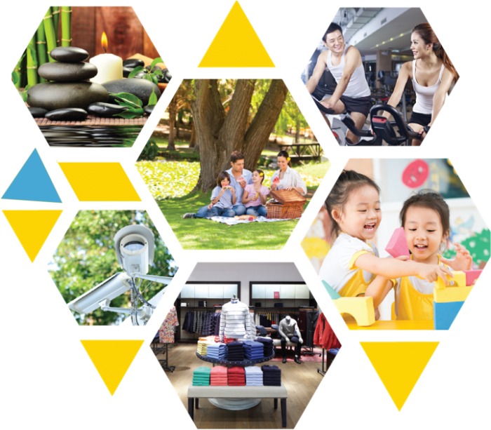 Nội khu: Công viên chính rộng đến 3ha, với hàng loạt tiện ích phục vụ sinh hoạt, nghỉ ngơi và vui chơi được thiết kế dành riêng cho cư dân. Vườn thượng uyển 3 miền Bắc-Trung-Nam với: Vườn cây chủ đề Mở cõi Đất Phương Nam, vườn cây Thương về Miền Trung, vườn cây Đất tổ Hùng Vương, vườn rải sỏi massage chân Trường Sa-nơi quy tụ đá sỏi sưu tập từ các đảo trên toàn cõi Việt Nam....