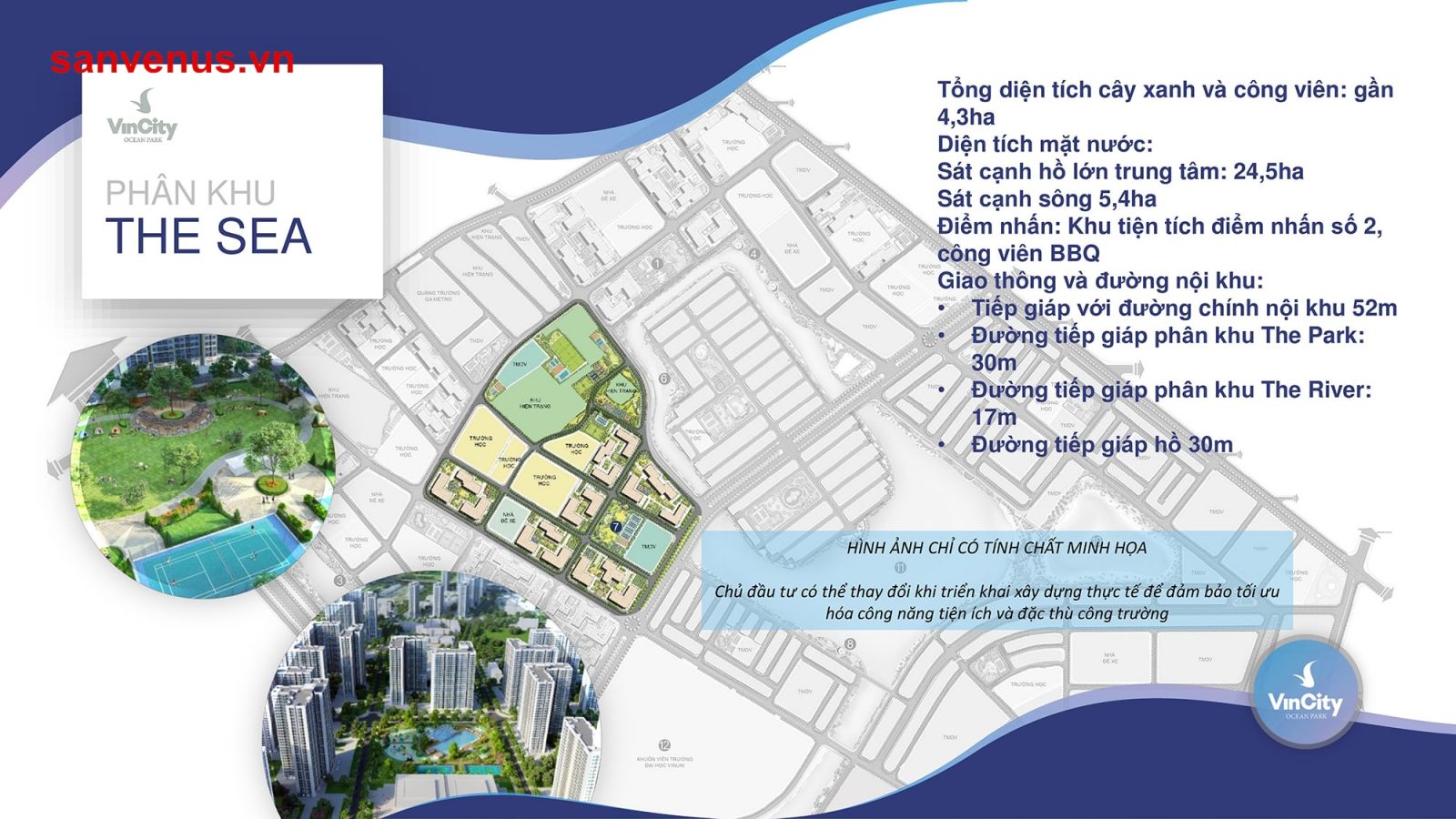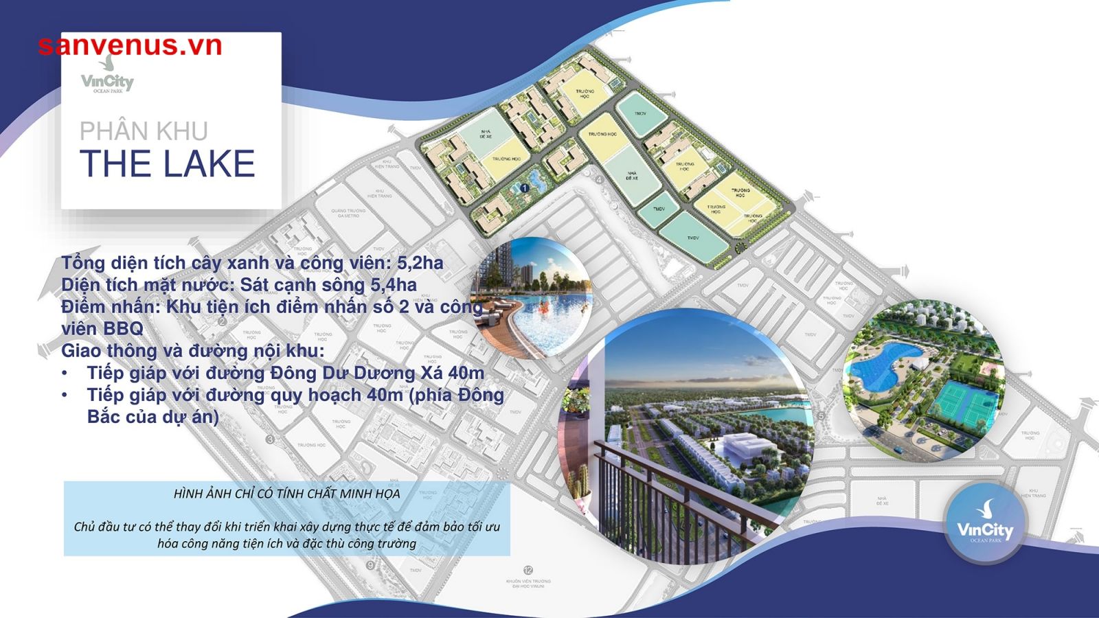 Với tổng diện tích cây xanh và công viên lên đến 5,2ha, diện tích mặt nước 5,4 ha.