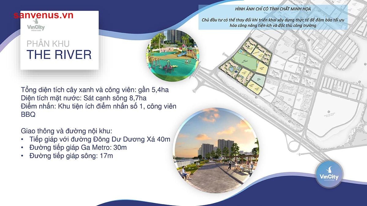 Theo quy hoạch, khu The River được xay dựng trên tổng diện tích gần 5,4ha trong đó diện tích mặt nước lên đến 8,7ha. Khu này có công viên BBQ.